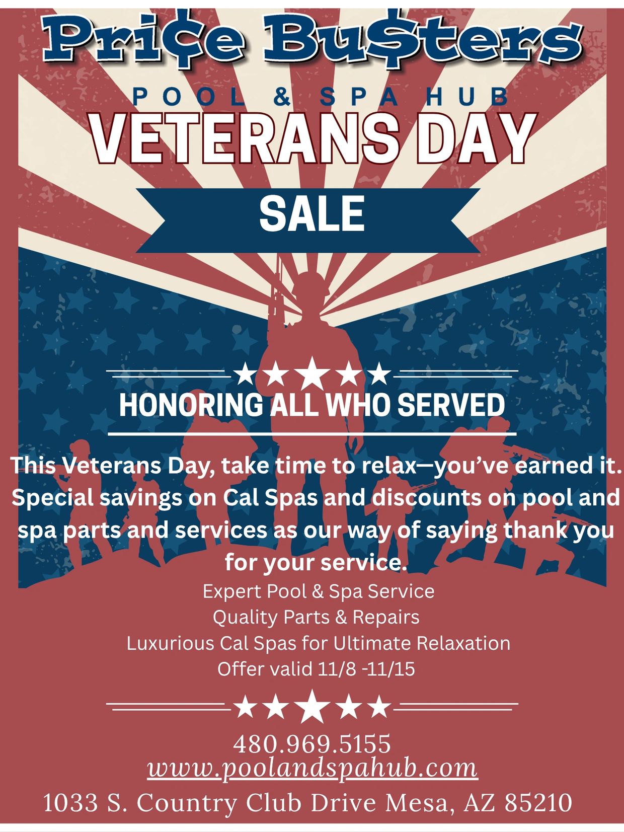 As a small token of our appreciation, we’re offering special Veterans Day savings on Cal Spas, plus great deals on pool and spa parts and services.